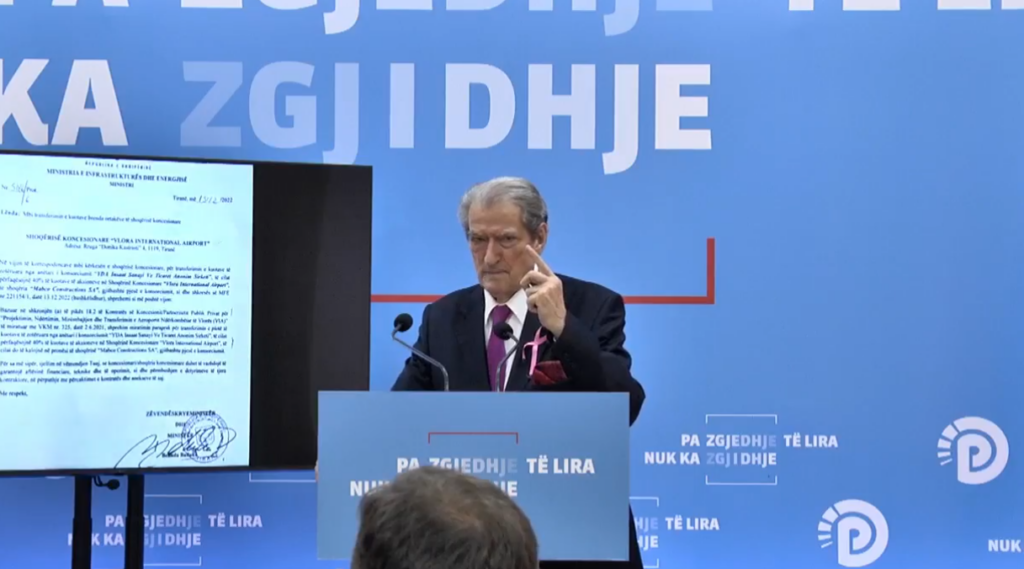 Lideri i opozitës, Sali Berisha, në deklaratën për mediat të mbajtur ditën e sotme, ka rikthyer vëmendjen te kontrata koncesionare e aeroportit të Vlorës, të cilën e cilëson si një aferë të pastër korruptive...