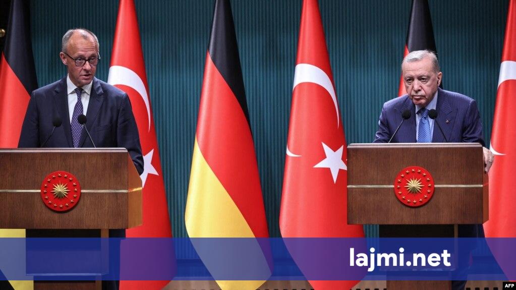 Presidenti turk, Recep Tayyip Erdogan, dhe kancelari gjerman, Friedrich Merz, u përplasën në një debat të ashpër mbi luftën në Gaza, gjatë një konference të përbashkët për shtyp në Ankara të enjten. Ndërsa...