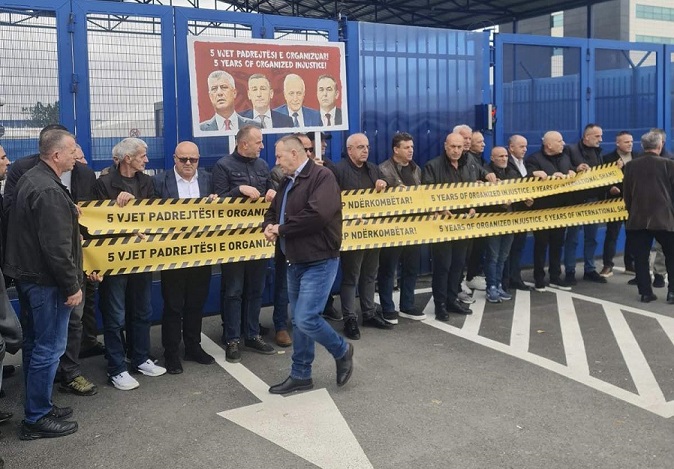 Në pesëvjetorin e arrestimit të Hashim Thaçit dhe të tjerëve, veteranër kanë nisur një protestë simbolike para objektit të EULEX-it. Në fotografi shihen prezent një numër i qytetarëve. “5 vjet padrejtësi...