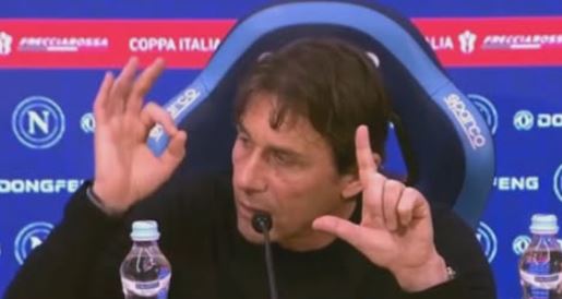 Reagime jo shoqërore të Antonio Contes ndaj gjyqtarit pasi që ai nuk pajtohej më vendimet e referit pas eleminimit të Napolit nga Coppa Italianë penalti ndaj Como-s Sport Mediaset tregoi reagimet e Contes...