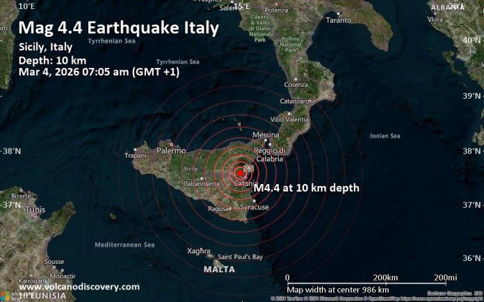 Një tërmet i fortë me magnitudë 4.5 goditi mëngjesin e sotëm në zonën e Catanias, duke u ndjerë qartë edhe në provincat e Mesinës dhe Sirakuzës. Sipas Institutit Kombëtar të Gjeofizikës dhe Vullkanologjisë...