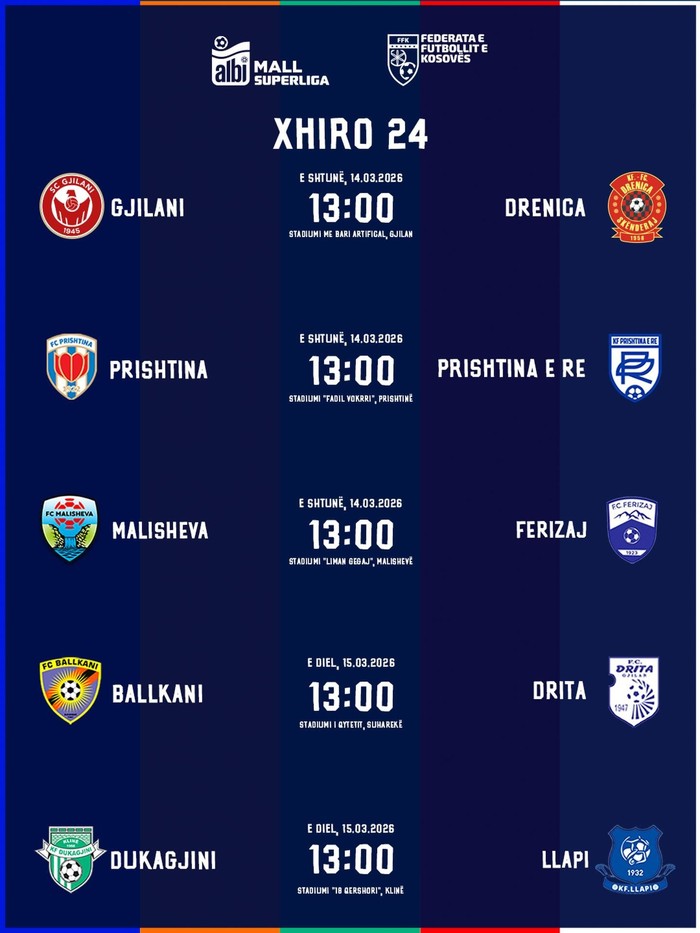 Është publikuar orari i javës së 24-të në Superligën e Kosovës. Duke filluar nga dita e shtunë, ku do të luhen tri ndeshje deri te dy ndeshjet e së dielës. Të shtunën zhvillohen këto ndeshje: Kurse të dielën këto: