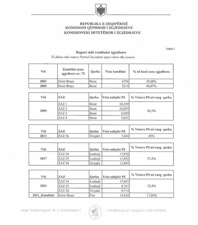Komisioni Qendror i Zgjedhjeve (KQZ) i është përgjigjur kërkesës së deputetit socialist Erion Braçe, duke i vënë në dispozicion të dhënat zyrtare mbi rezultatet e tij elektorale ndër vite. Në dokumentin...