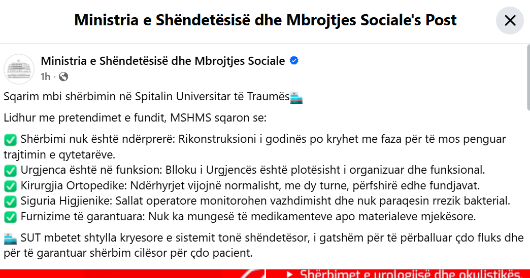Ministria e Shëndetësisë dhe Mbrojtjes Sociale ka reaguar pas pretendimeve të fundit lidhur me funksionimin e Spitalit Universitar të Traumës, duke garantuar se shërbimet për qytetarët nuk janë ndërprerë....