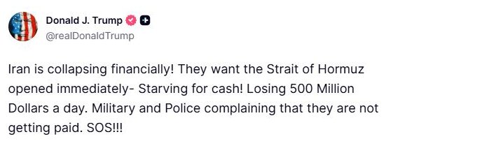Presidenti i Shteteve të Bashkuara, Donald Trump, ka deklaruar në rrjetin social Truth se Irani po përballet me një kolaps financiar, duke pretenduar se vendi po humbet rreth 500 milionë dollarë në ditë...